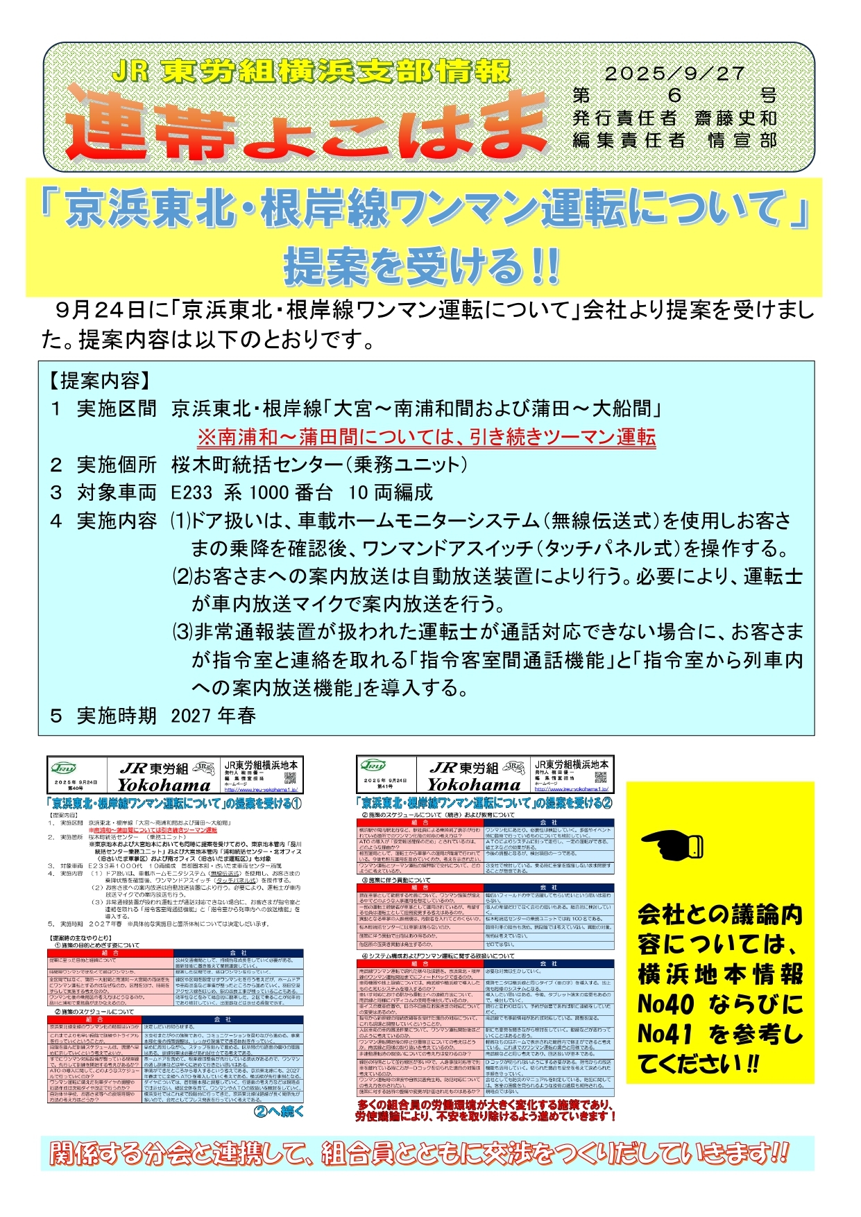 「京浜東北・根岸線ワンマン運転について」提案を受ける!!