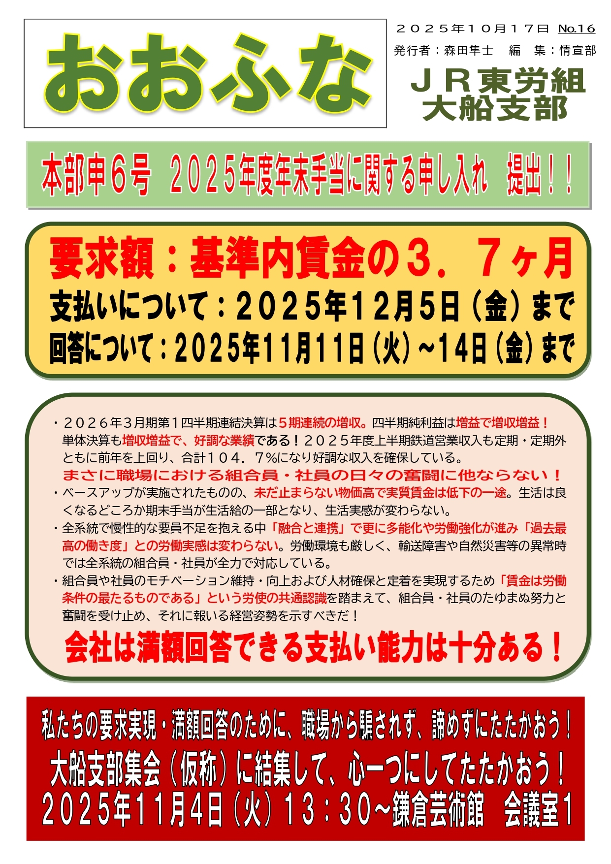 大船支部「年末手当総決起集会」開催!